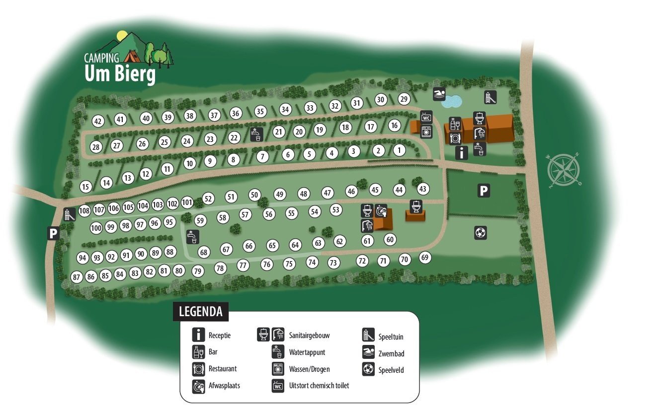 Restaurant Um Bierg, de speelplaatsen en het zwembad vind je aan de rechterzijde van de camping. De staanplaatsen hebben daarom geen geluidsoverlast van onze faciliteiten. Geniet op je plaats van de fluitende vogels in de bomen!